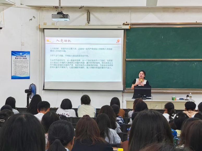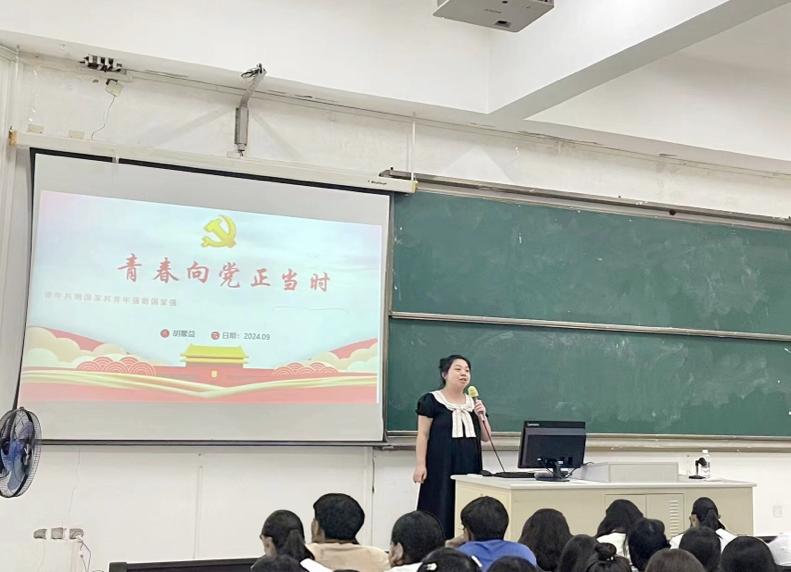胡馨益首先介绍了三亿各党支部的基本情况,同时就党建联合会组织进行了详细的讲解,加深了新生们对各级党组织的了解和认识。她以学习贯彻党的二十届三中全会精神为切入点,主要围绕为什么加入中国共产党、怎样加入中国共产党、如何做到以党员标准严格要求自己等几个方面,讲解了入党条件、入党程序与步骤、入党申请书的撰写格式和内容等注意事项,并就她的入党经历希望新生们树立正确的入党动机,提高自身的业务能力,积极参与丰富的文体活动,通过实际行动向党组织靠拢。